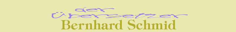 Homepage von Bernhard Schmid; Übersetzer; Übersetzungen; Englisch; Deutsch; Belletristik; Sachbuch; Krimi; Thriller; Erfahrung; Slang; Slangspezialist; Autor; American Slang; British Slang; Ed McBain; Iceberg Slim; John Harvey; Larry McMurtry; Tom Wolfe; Bruce Wagner; Budd Schulberg; Robert James Waller;Elmore Leonard; Patrick Neate; Ed Sanders; Peter Matthiessen; Barry Gifford; Stephen Hunter; Bob Woodward; Gail Sheehy; Charles Shaar Murray; Randy Shilts; Allen Ginsberg; Eminem; Shana Alexander; Alan